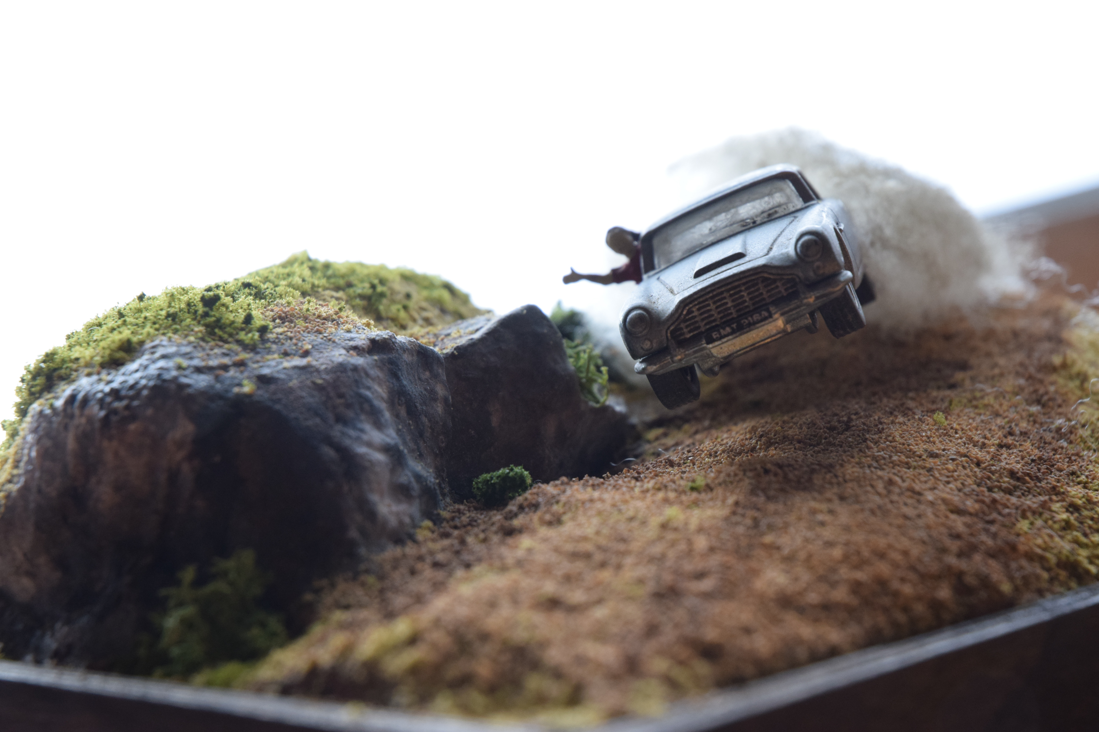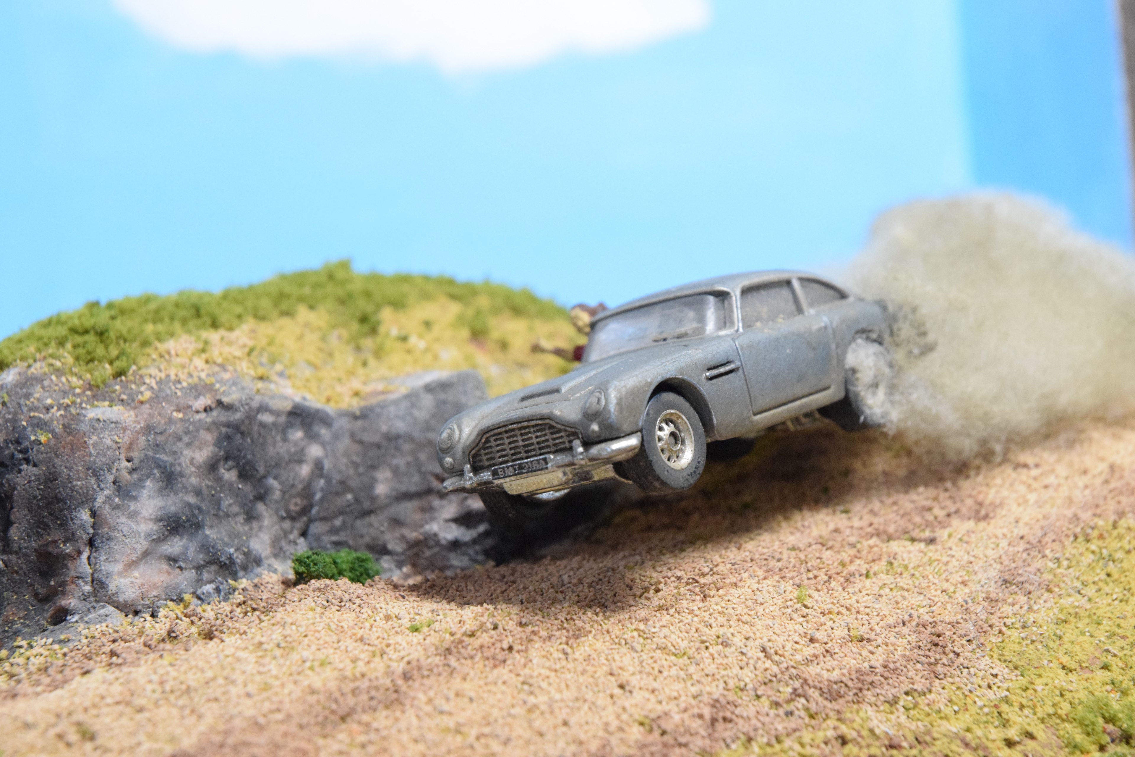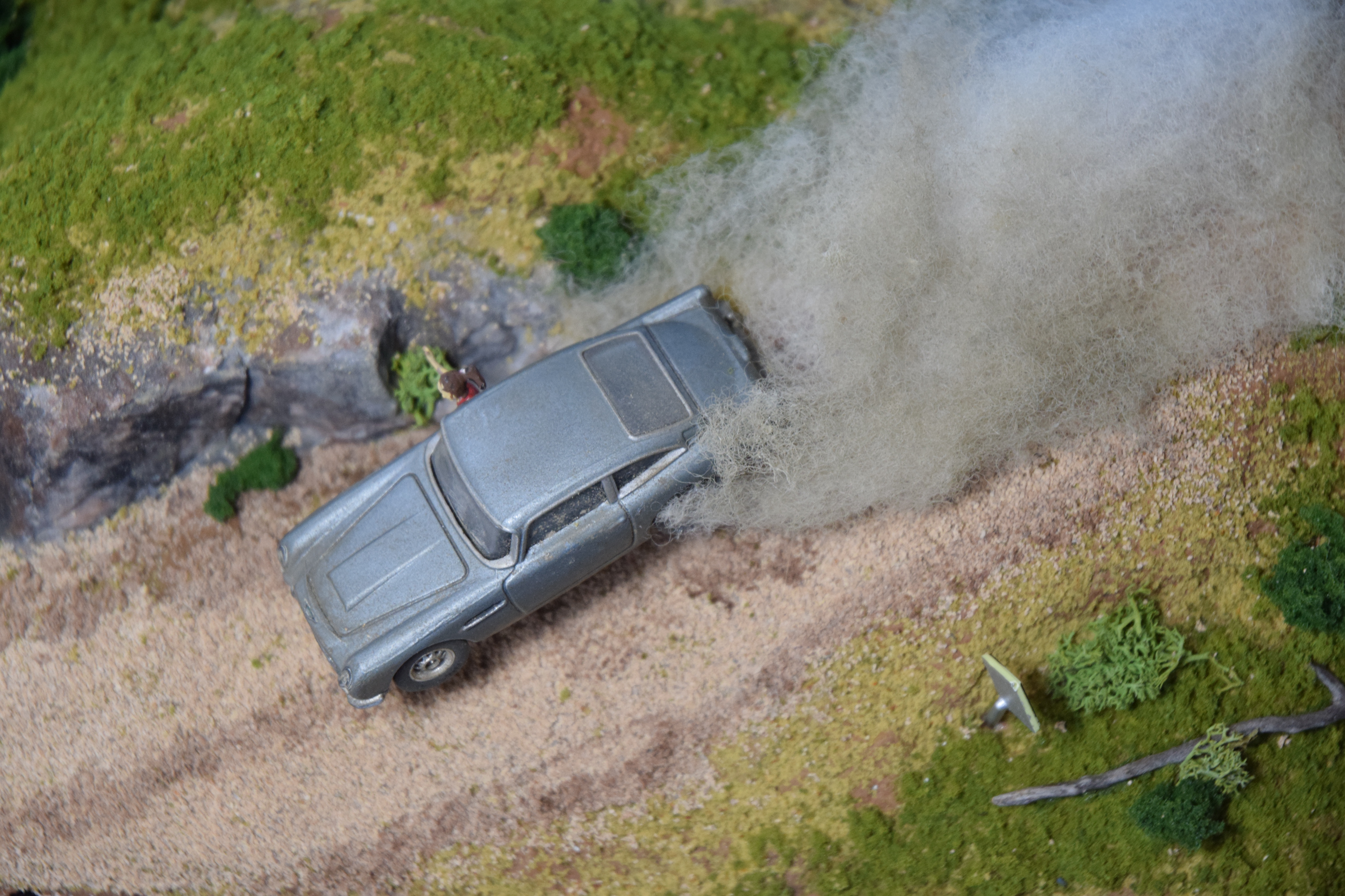 The dust cloud obscures 2 brass rods superglued to the chassis of the Hot Wheels Aston Martin. The rods penetrate the dirt hill and merge with the inner structure of the scenery to support the weight. Getting the angle such that the box was still closeable was a nightmare.